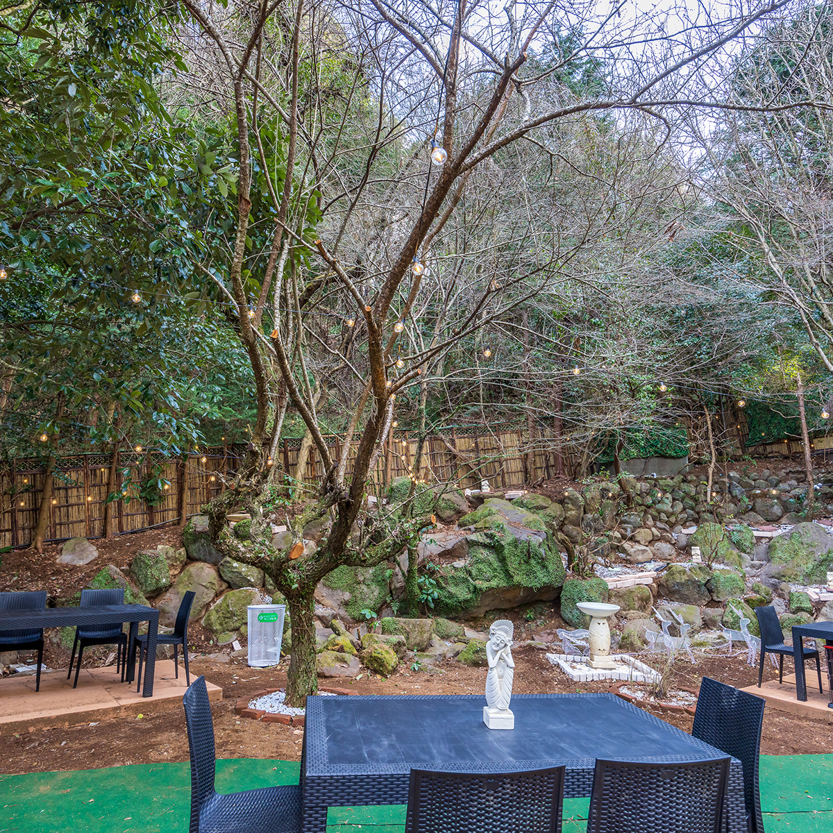 静岡と神奈川の県境を走る<千歳川>の源流近くに、泉の森 IZUMI Forestと銘打って、古代樹風の巨木や巨石などの自然を生かした庭を作り上げました。普段自然と接することのない都会の人々に癒しの空間として楽しんで頂ければ幸いです。