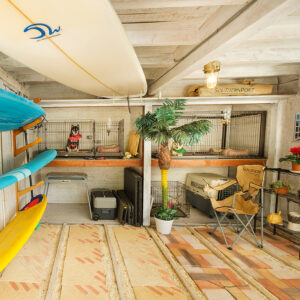 ●土間ガレージ:犬小屋(大)2,犬小屋(小)1、BBQスタンド1,BBQコンロ1、サーフボード・シェルフ、ガーデンテーブル1&折り畳みポータブルチェア2