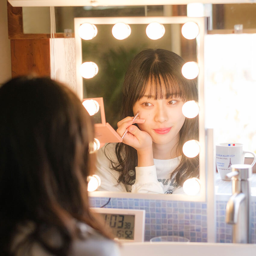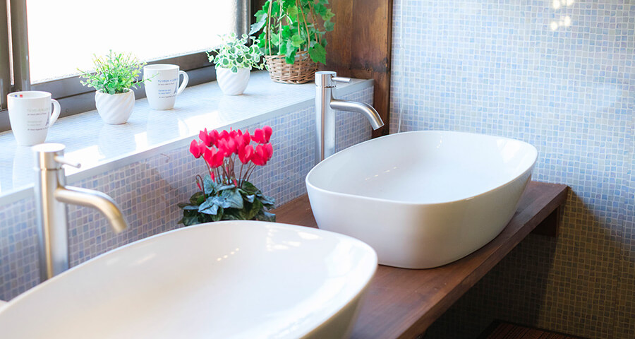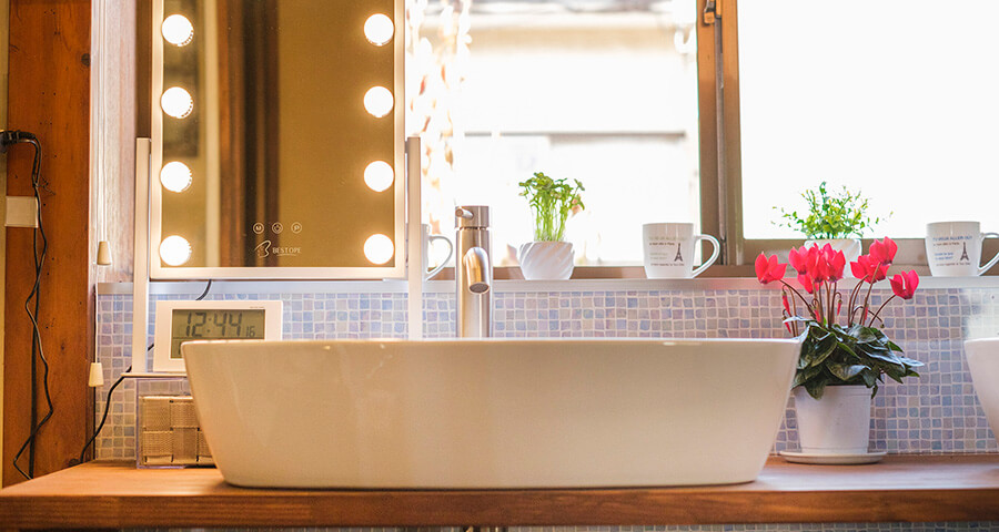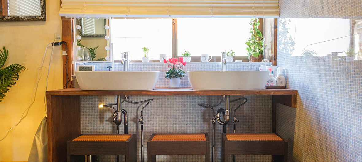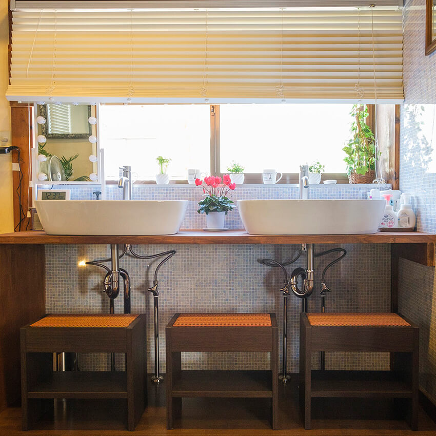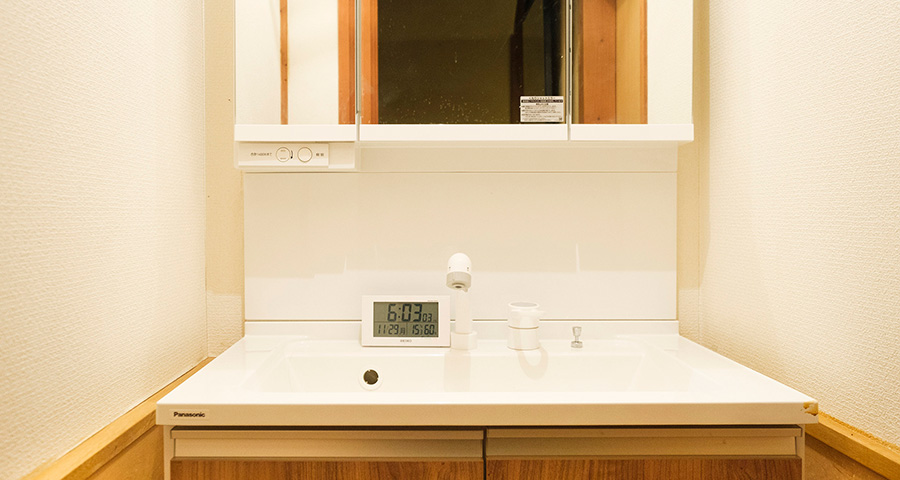 洗面ボウル2、畳椅子3、化粧用ハリウッドミラー、SHARPプラズマクラスター扇風機、ヘアドライヤー