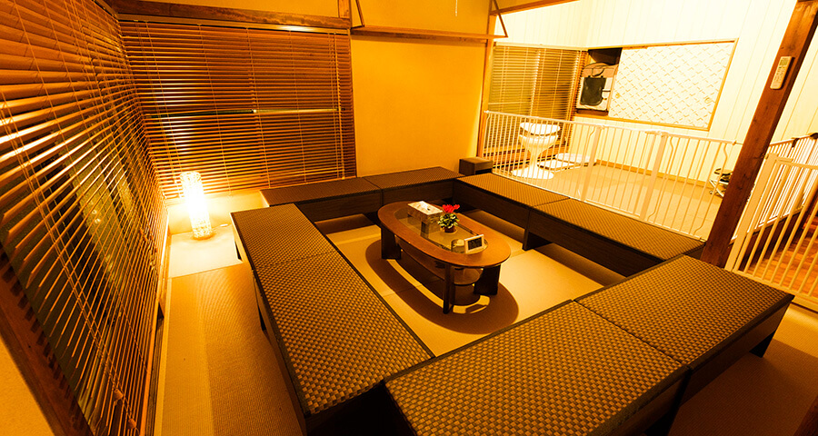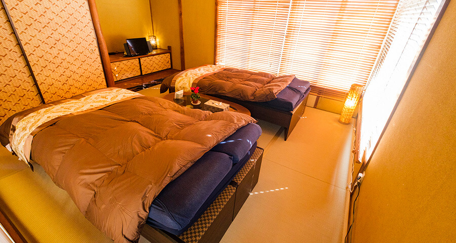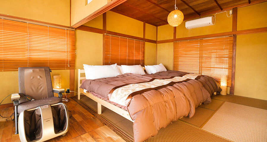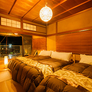 母屋2F和室(固定ベッド3)+母屋1F洋室(固定ベッド2)+離れ2F和室(畳ベッド2)