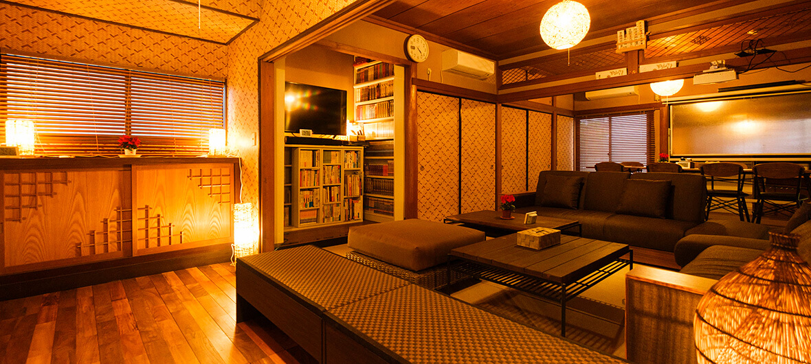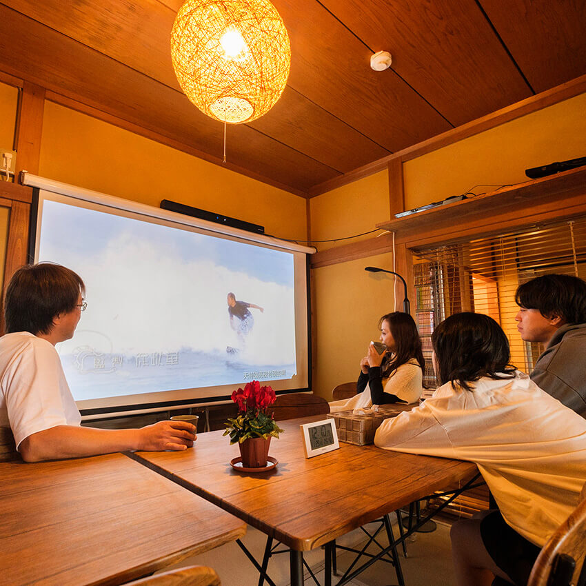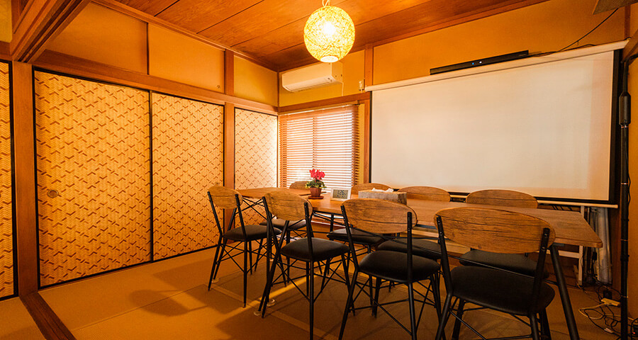●セミナースペース:6畳エアコン、大型テーブル2台+椅子10脚、プロジェクター、スクリーン、Blu-ray DVDプレイヤー